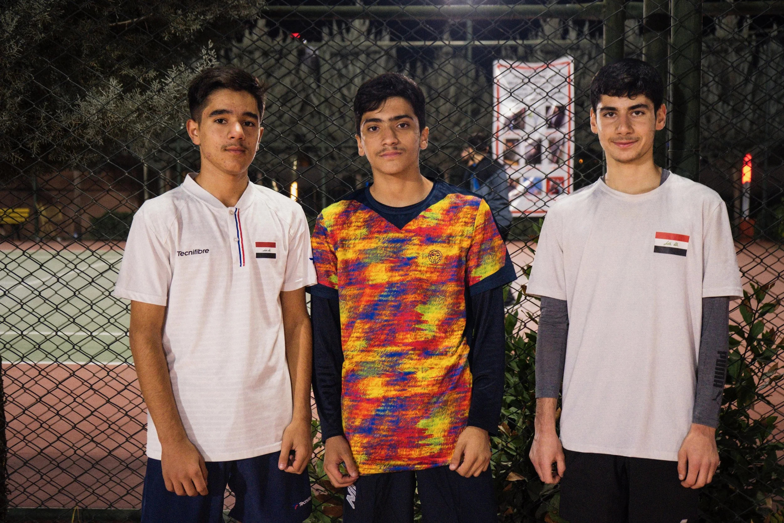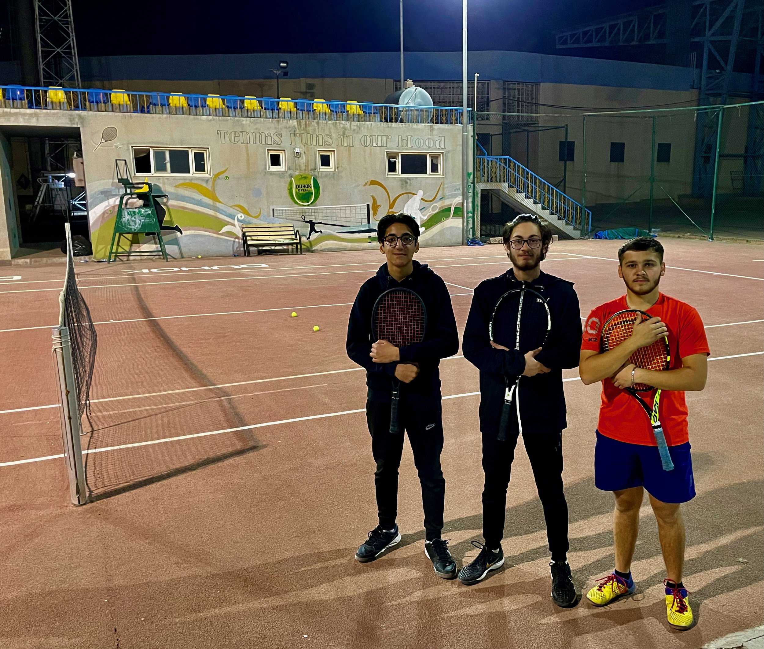 Friends and teammates Shihan, Amedi and Muhammed practice for a Baghdad tournament at the Dohuk tennis club in November 2021.
