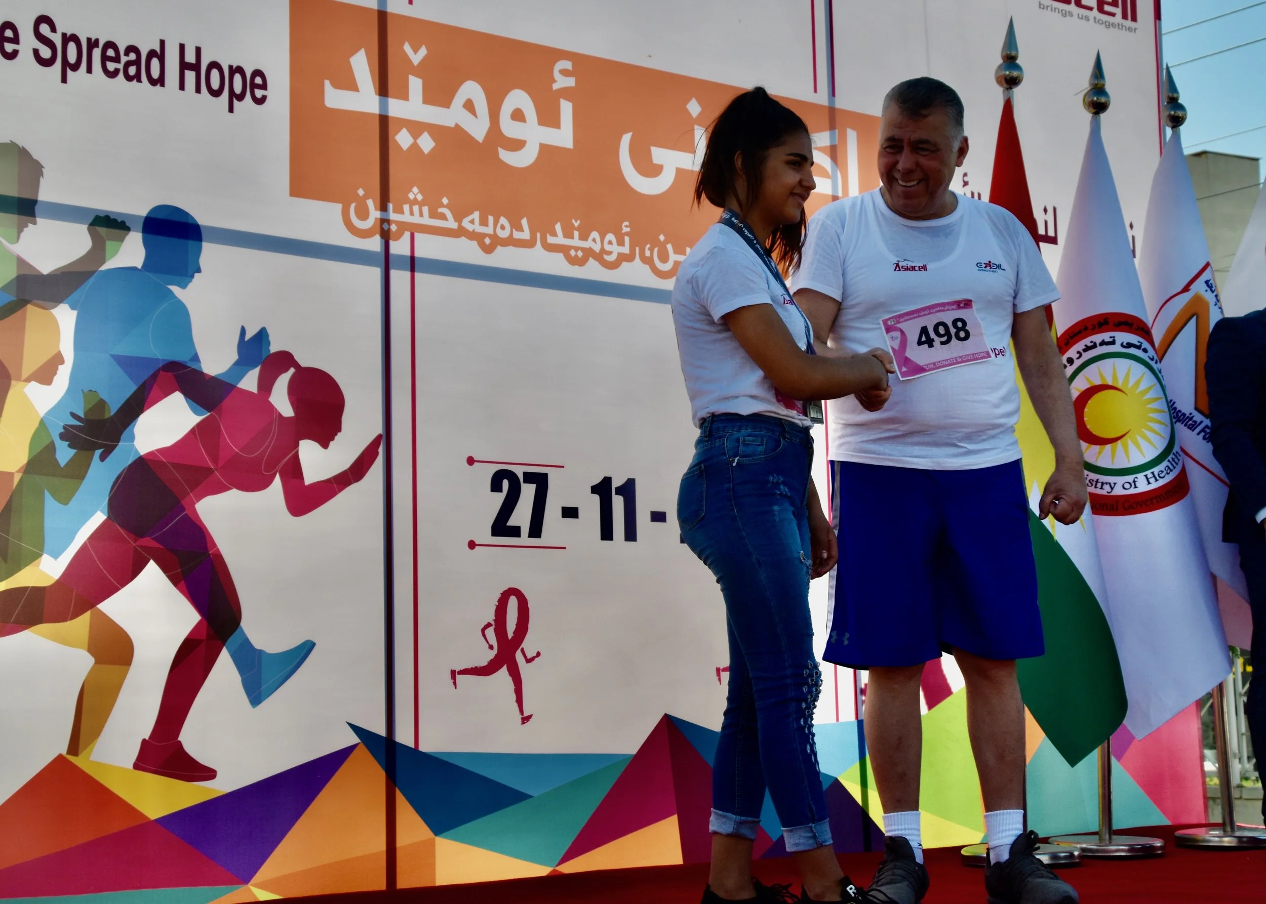 Zainab, a resident of the Darashakran Refugee Camp, accepting her prize for winning second place in the 2021 Iraqi Marathon Fun Run.